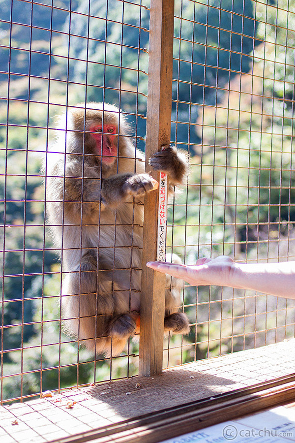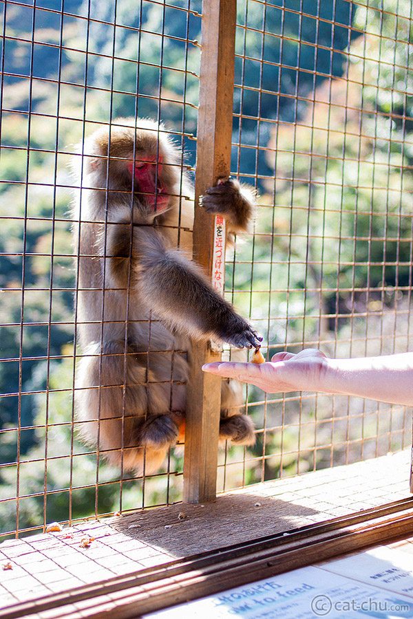 You’re able to feed them too! However, this is all done inside of a feeding building and only with the food the park sells. The windows are covered with wire to protect visitors. The monkeys from the outside climb up to the window when they want food. You can tell they’re used to this because the moment they see you, they stick their arm in, waiting for you to offer them something. They’re pretty smart too, as my husband tried to trick one by offering an empty peanut shell. The monkey immediately threw it to the ground XD;;