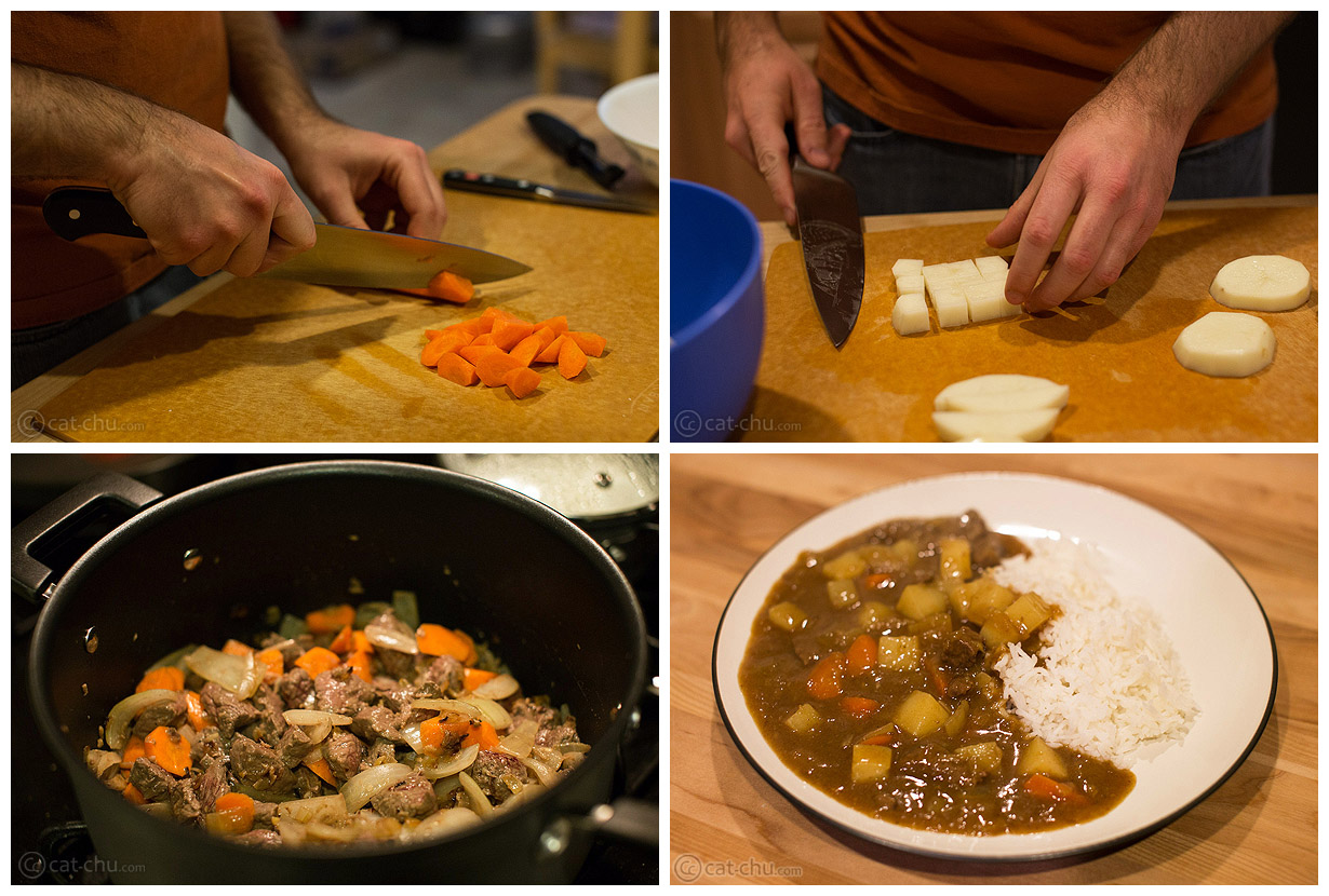 I wanted to take photos of my husband making Japanese curry, and I actually got a photo of every step. However, it was too many! I ended up picking out 4 photos (prep, cooking, and final result) to stick together.