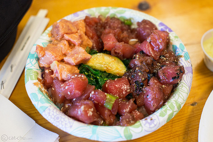 For lunch, we were really craving a ahi tuna poke bowl. A quick search on Yelp led us to Eskimo Candy, where we ordered a poke bowl and a combo lunch plate. That really, really hit the spot! The poke bowl was especially good, and we loved that it came with four types of poke: spicy, shoyu, furikake, and wasabi.