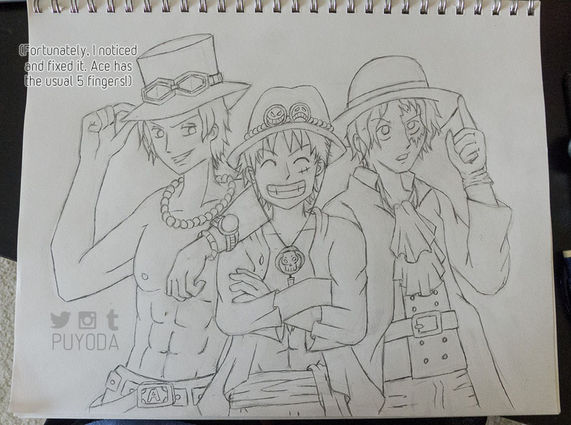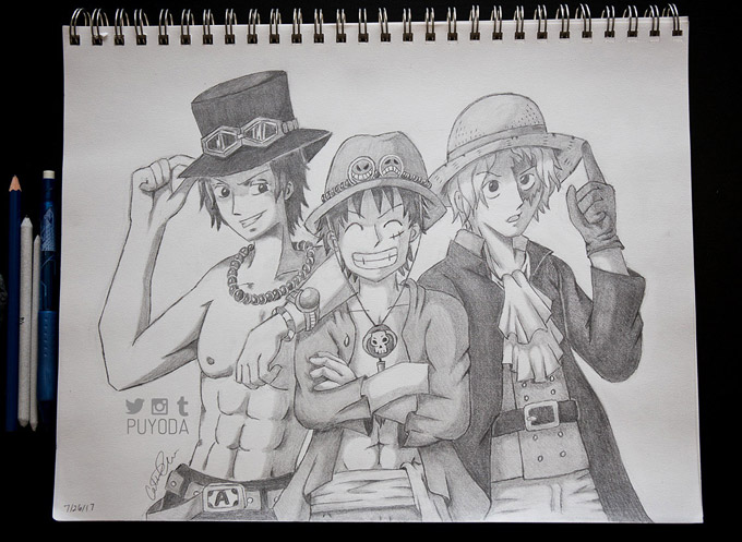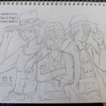 In a previous entry, I showed off some quick sketches I did as practice, and they were a good starting point for me to get back into it. Then Rezina suggested we do an art trade together! That really gave me the motivation and boost I needed. We decided on a black and white One Piece trade since we both love the series. I requested Zoro, and she requested Ace, Luffy, and Sabo.
