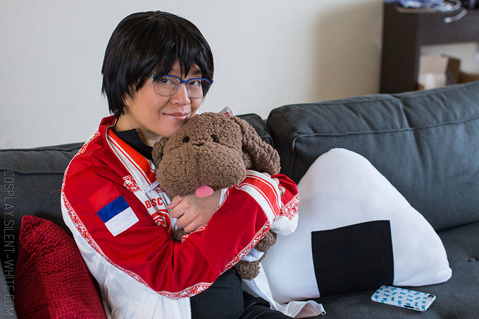 The second is Yuri from Yuri on Ice. I already have photos of this cosplay, but I realized I never took photos with a new accessory I got for it: Makkachin!