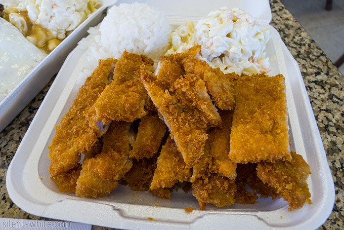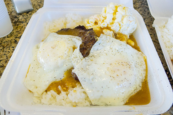 After that, it was late, and we were starving. We headed to L&L Hawaiian BBQ for a quick and easy lunch. This is a chain that is also available on the mainland (especially in California)! My husband and I shared a chicken katsu and a loco moco – hamburger patty over rice, topped with gravy and eggs.