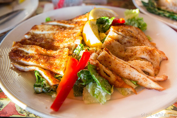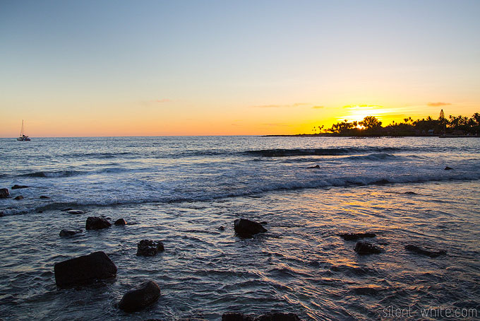 At night, we spent some time in the actual Kona area (our hotel was a bit south of it). After some shopping, we chose the Kona Inn Restaurant for dinner, where I ordered a Caesar salad topped with calamari. This was surprisingly good! The calamari was so tender and the breading was very light. It didn’t have the usual heavy feeling of fried calamari. We chose this restaurant because it has a lovely view of the ocean, and we were able to watch the sunset as we ate.