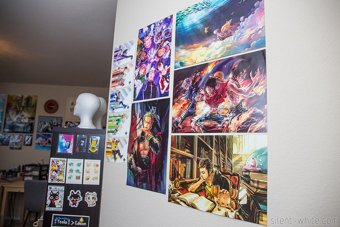 I used the other wall of the entryway for posters, which isn’t quite filled out. (Shout out to a couple of my favorite artists, Lowah and Zzyzzyy, for those posters.) By the way, you’ll see a lot of posters on the wall as I show more photos! Most of them are collected from the years I’ve been to Anime conventions. While a few are official art, most are fan art by very talented artists!