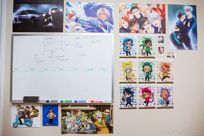 A neat thing about the cat-themed Yuri on Ice prints to the right is that they’re actually folders. They double as decoration and a place for me to store note cards that I jot measurements down on. (Also below the whiteboard is another drawing by Rezina, and the little Yuri on Ice polaroids were from Tara!)