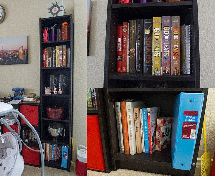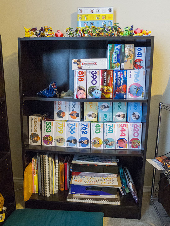 The other bookshelf in the game room used to have manga on it, but I’ve cleared out enough that I can use it to store some of my toy figure boxes and art supplies. This is great because that’s right near where I take my toy photos.